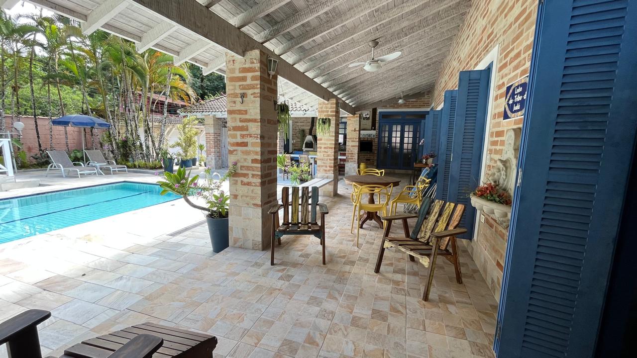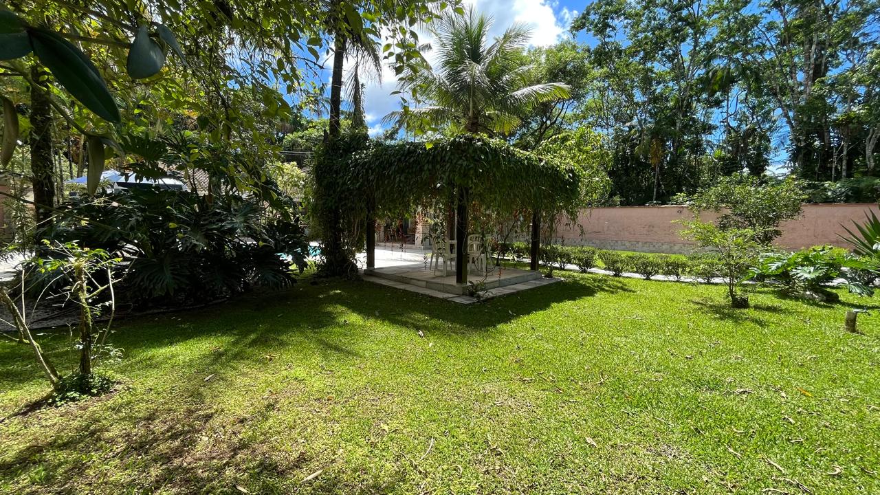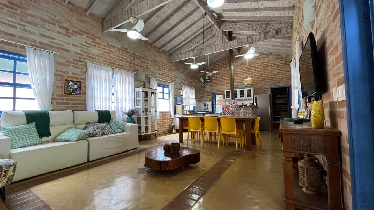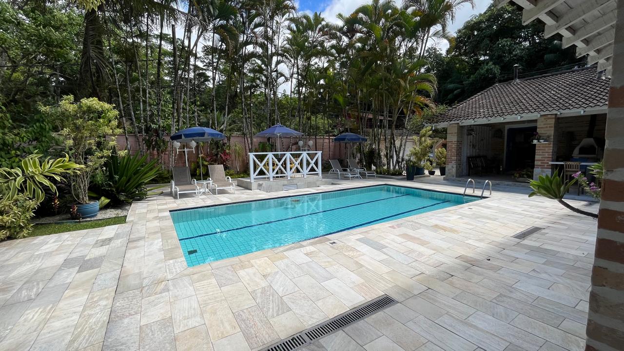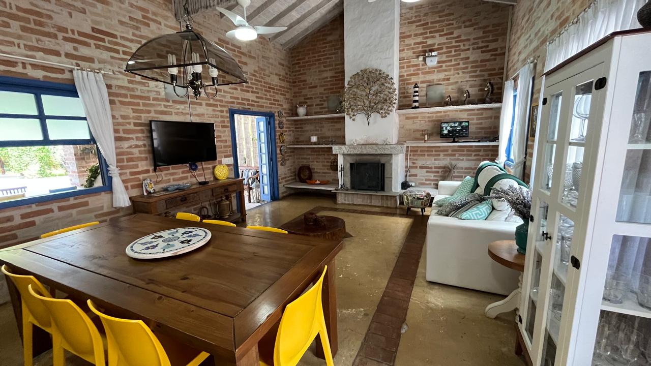 amplo jardim, área gourmet com piscina privativa, churrasqueira, forno de pizza a lenha, toda área externa climatizada com ventiladores de teto, também possui 4 suítes com mezanino, sendo 3 delas com acesso para a área externa do imóvel, sala de estar ampla em 2 ambientes, com lareira, integrada com a cozinha, sala de TV, lavabo, lavanderia e vaga para 5 autos.