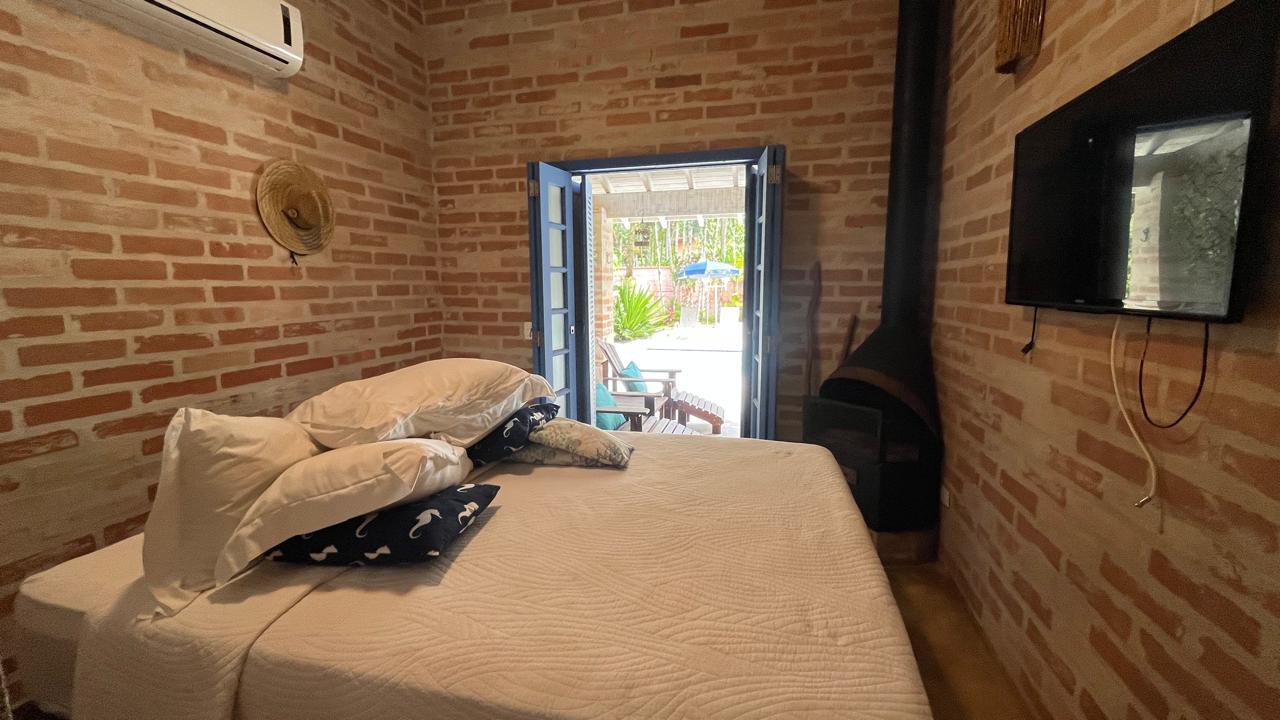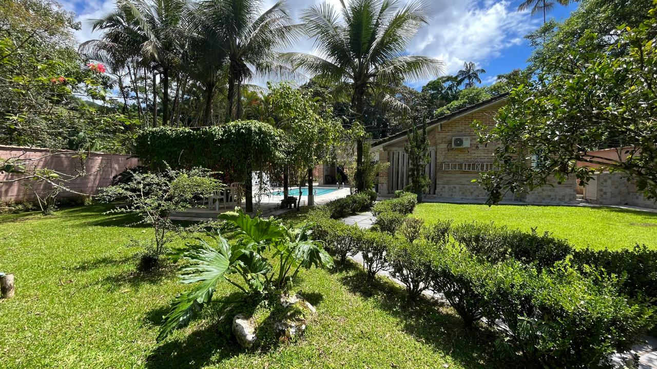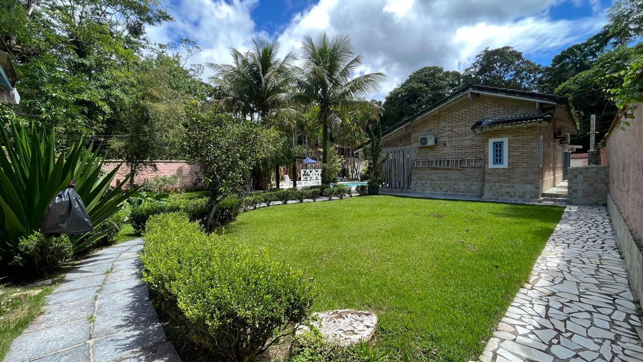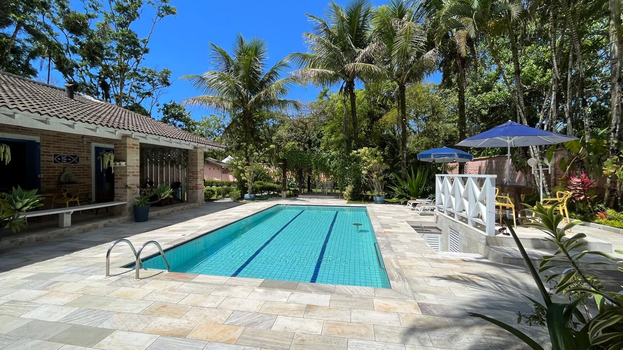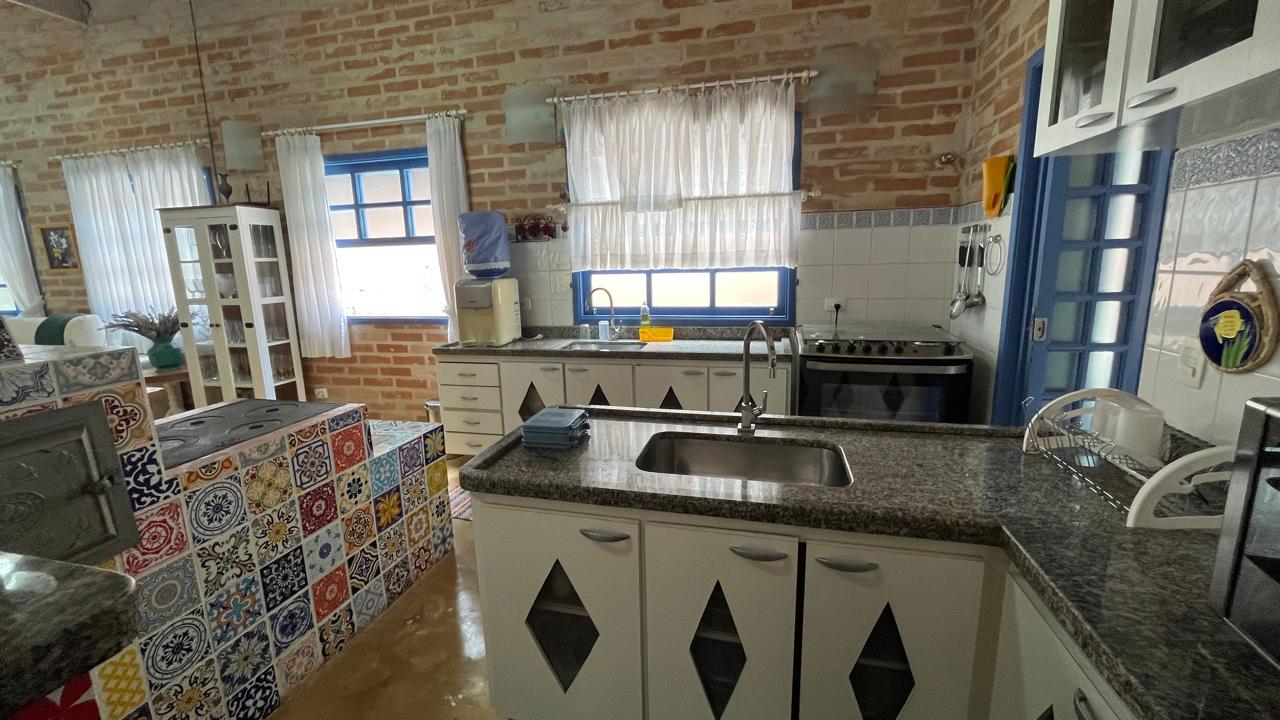 amplo jardim, área gourmet com piscina privativa, churrasqueira, forno de pizza a lenha, toda área externa climatizada com ventiladores de teto, também possui 4 suítes com mezanino, sendo 3 delas com acesso para a área externa do imóvel, sala de estar ampla em 2 ambientes, com lareira, integrada com a cozinha, sala de TV, lavabo, lavanderia e vaga para 5 autos.